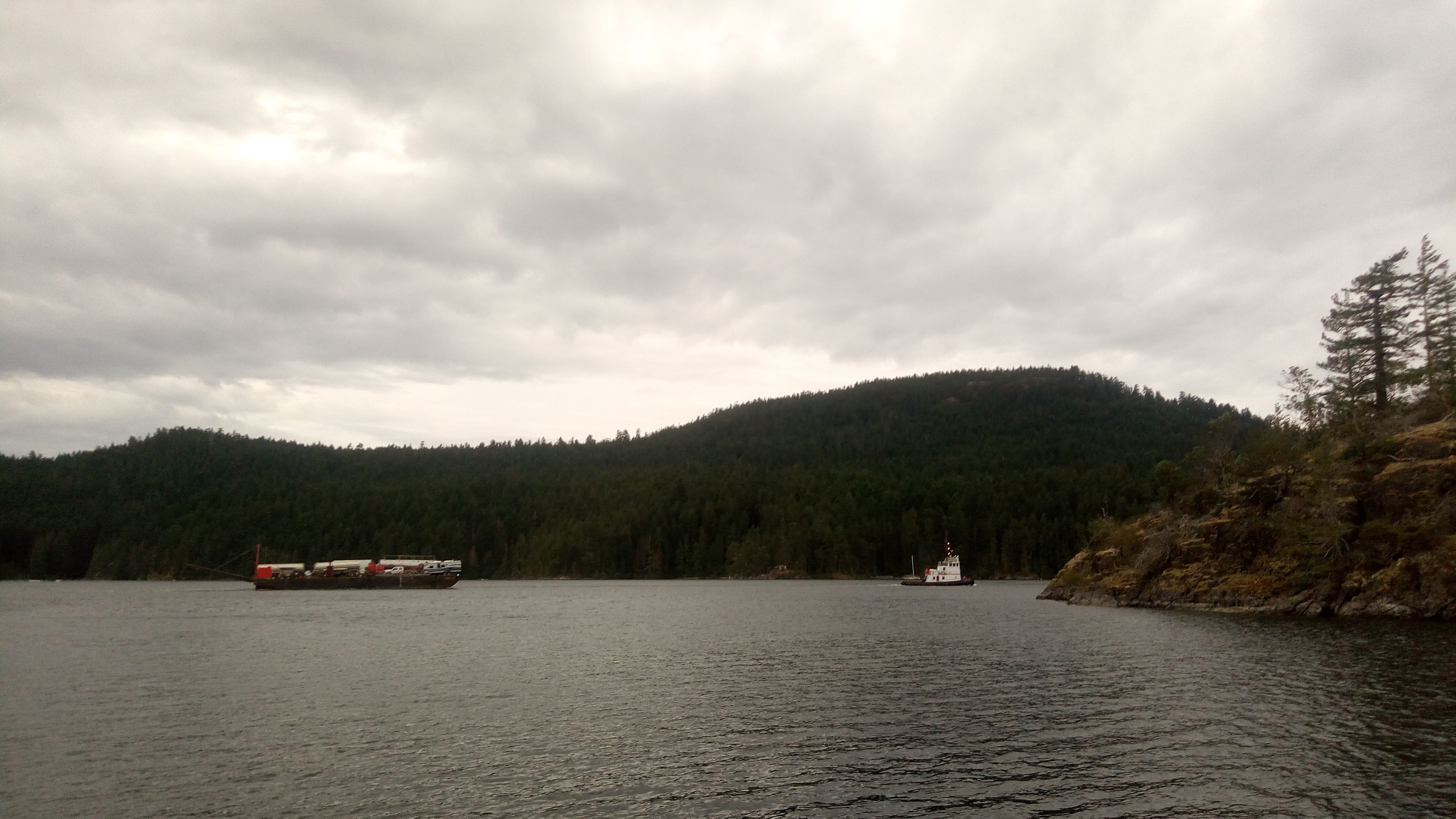There is a moderate amount of industry in the area, mostly aquaculture of one kind or another: fish farms and oyster farms, in particular. We saw this tug hauling oil tankers and other vehicles into the inlet, and come out a few hours later with a much larger load.