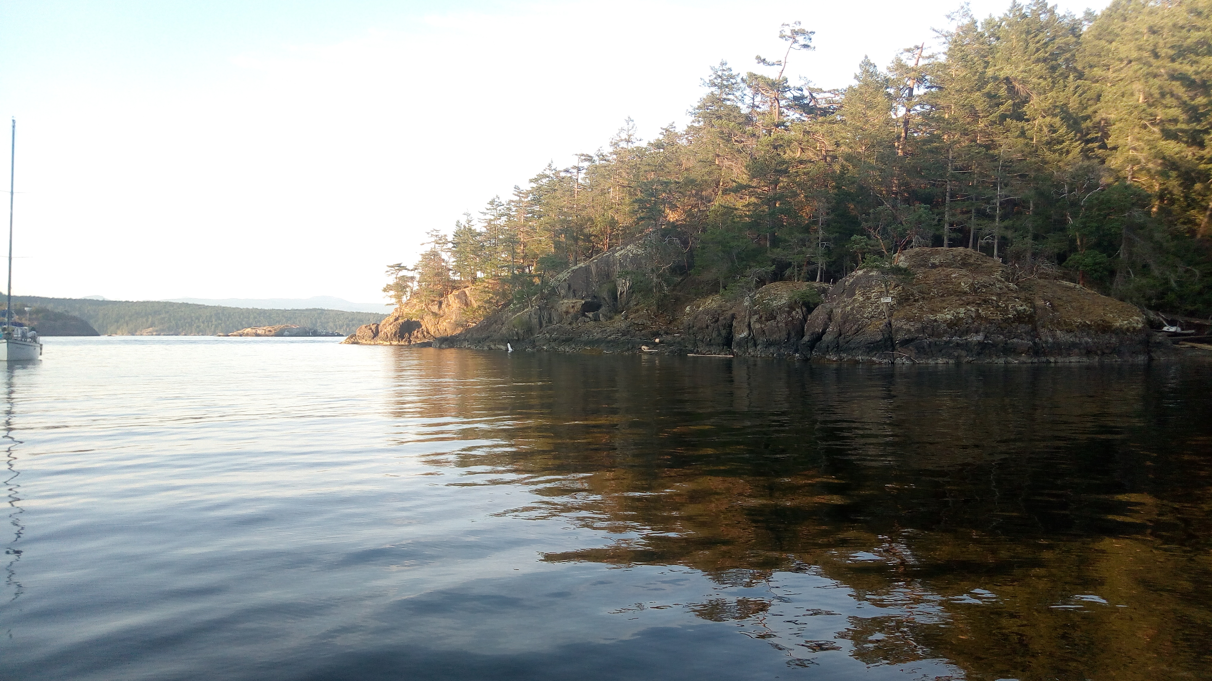 In this case, we simply wanted to circumnavigate the island (at high water) that sheltered our cove, but once out in Tenedos Bay proper a dozen or more pacific white-sided dolphins came zooming by, porpoising along, and swirled around like they were corralling fish beneath the surface. It was amazing, but I didn't get a picture that actually shows them in action. We were too busy watching in wonder.